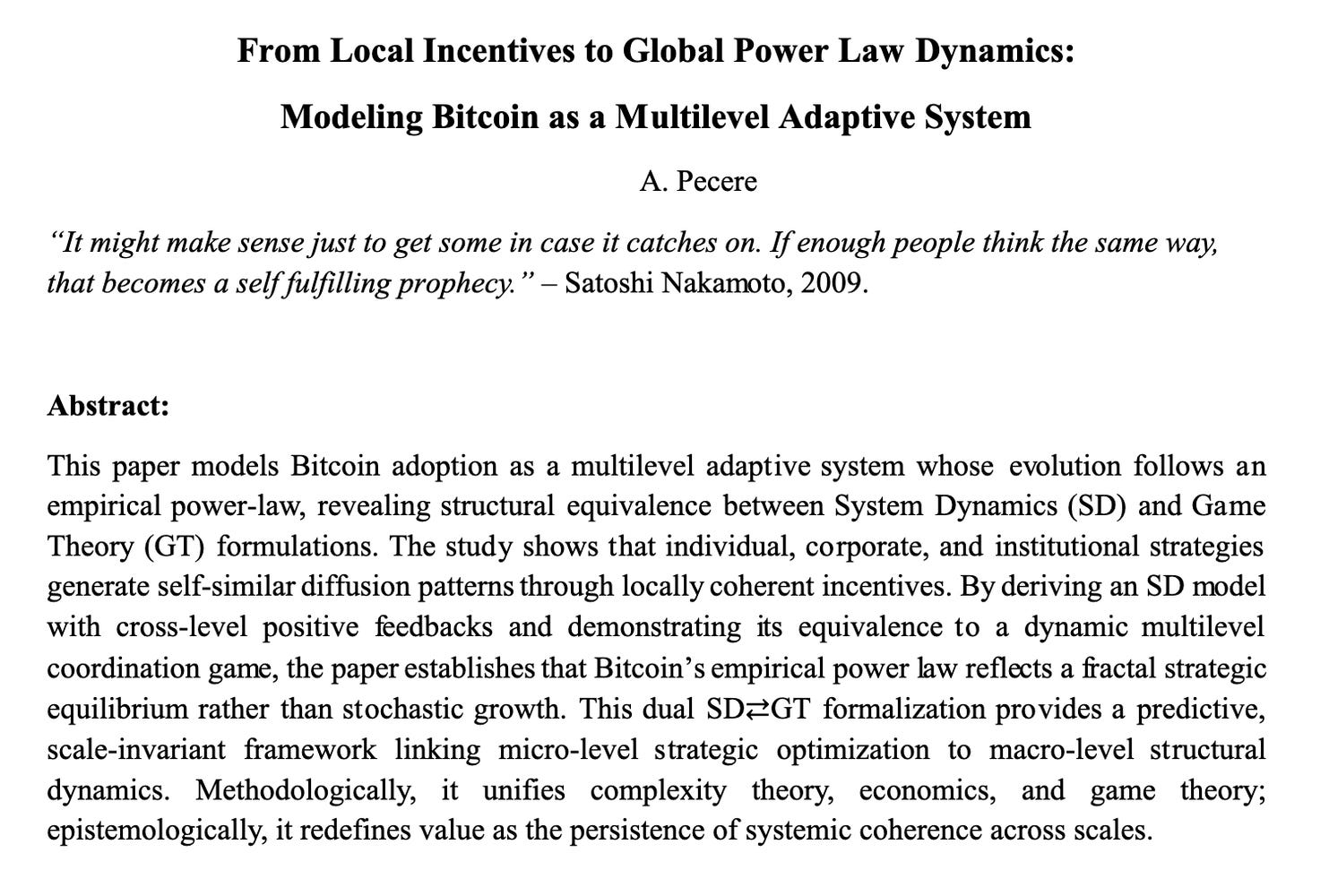 Pecere, Adriano. “From Local Incentives to Global Power Law Dynamics: Modeling Bitcoin as a Multilevel Adaptive System.” Preprint, November 2025. DOI: 10.13140/RG.2.2.34945.93289