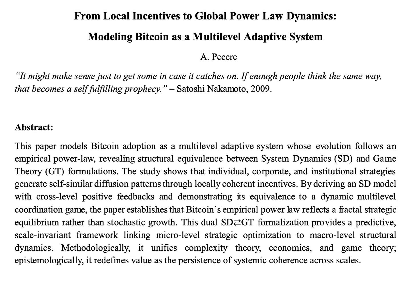 Pecere provides a theoretical explanation for why Bitcoin adoption follows a power law. By proving the equivalence between system dynamics and game theory, the paper demonstrates that Bitcoin’s growth results from strategic coordination across different levels.
